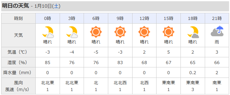 で、ここら辺の天気予報を見ると、明日はほぼ一日穏やかに晴れる模様です。